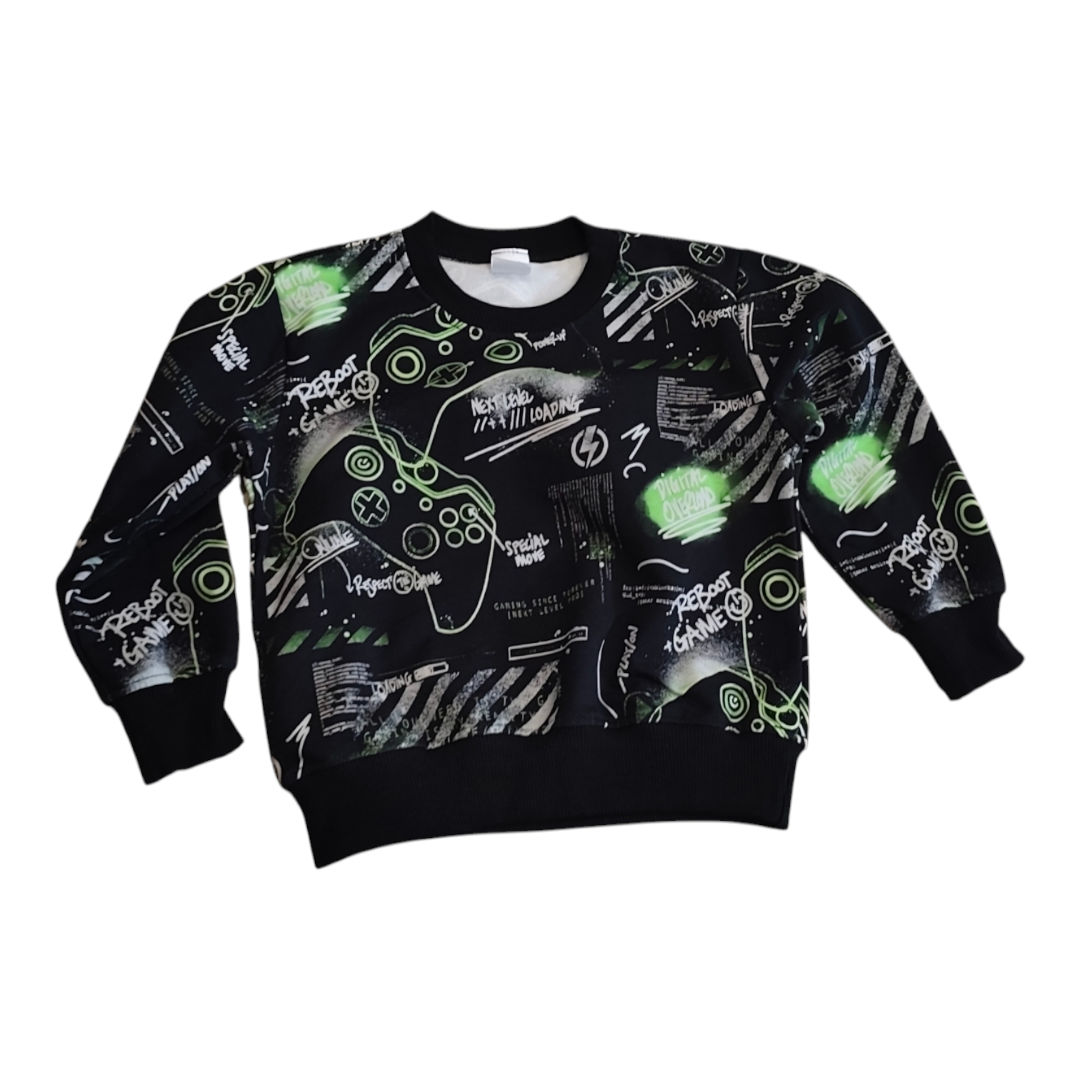 Nowoczesna bluza dla chłopca z dynamicznym, gamingowym nadrukiem. Motywy kontrolera, grafik i neonowych akcentów w odcieniach zieleni sprawiają, że bluza idealnie wpisuje się w styl młodych fanów gier i nowoczesnego designu.
