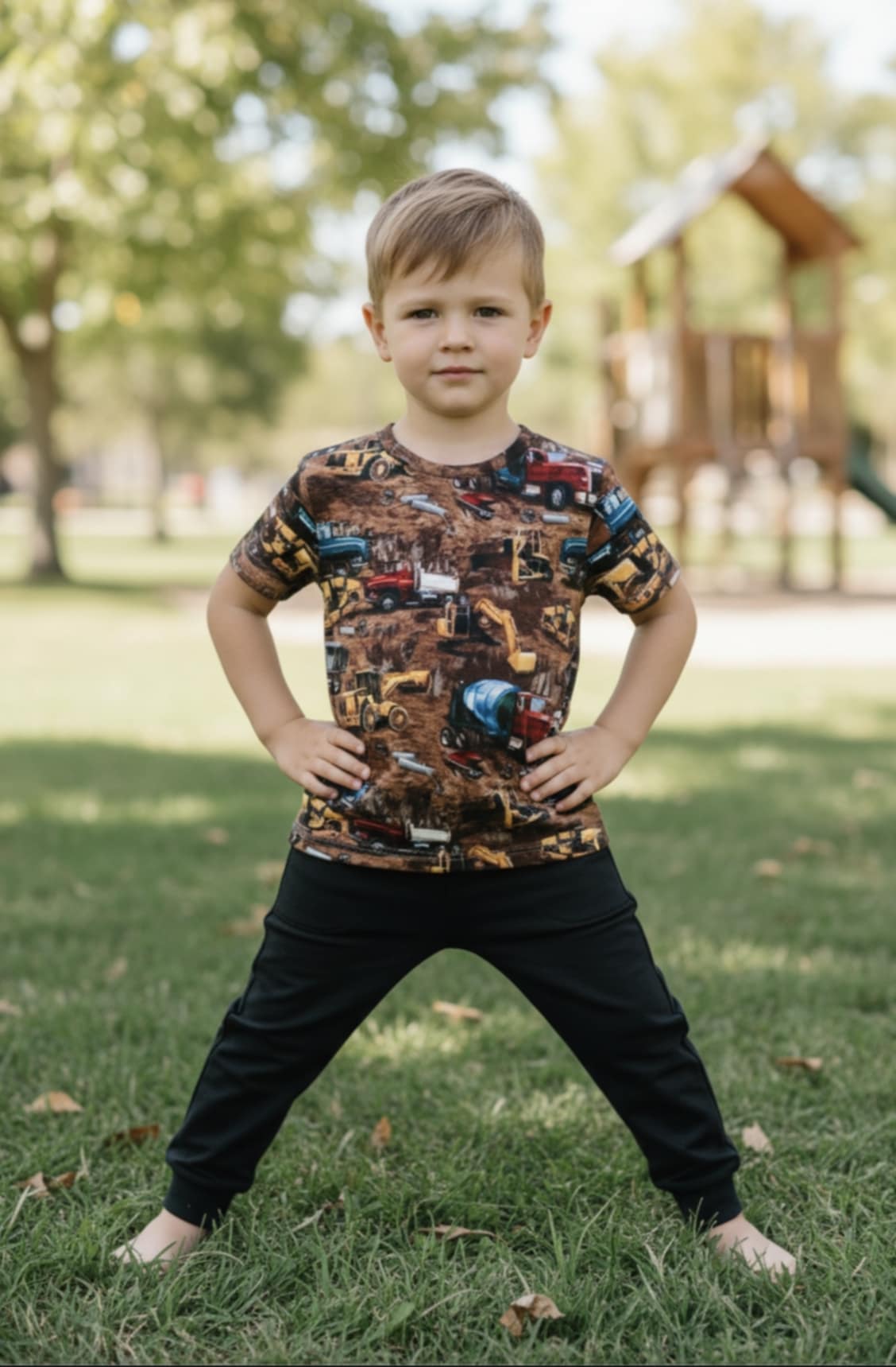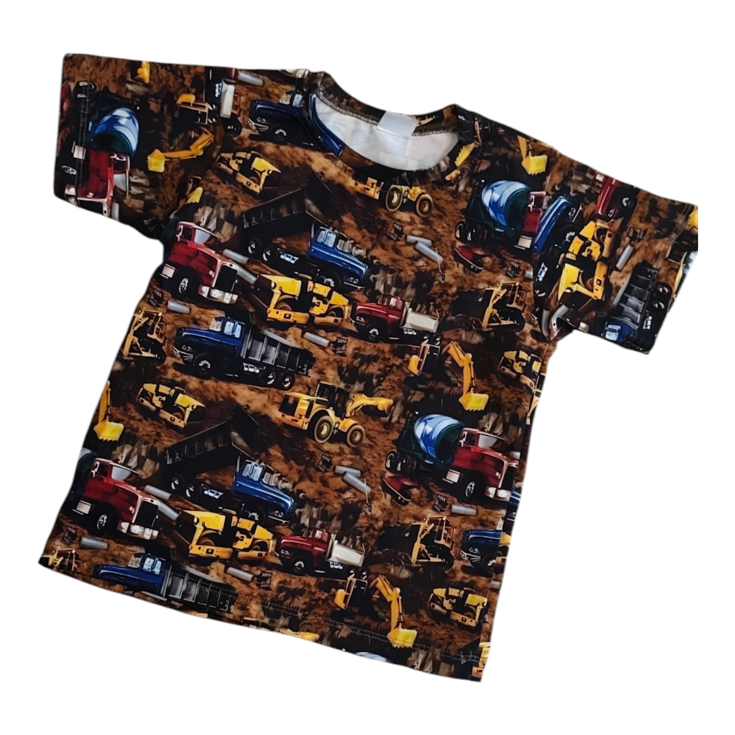 Kolorowa koszulka dziecięca z cyfrowym nadrukiem pojazdów budowlanych – koparek, betoniarek i ciężarówek. Idealna propozycja dla małych fanów maszyn budowlanych. Koszulka świetnie sprawdzi się na co dzień – do przedszkola, szkoły i na zabawę.
