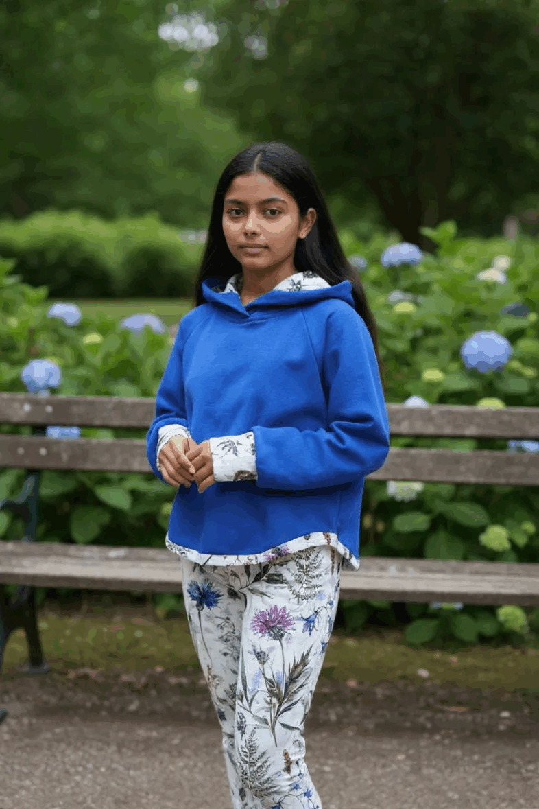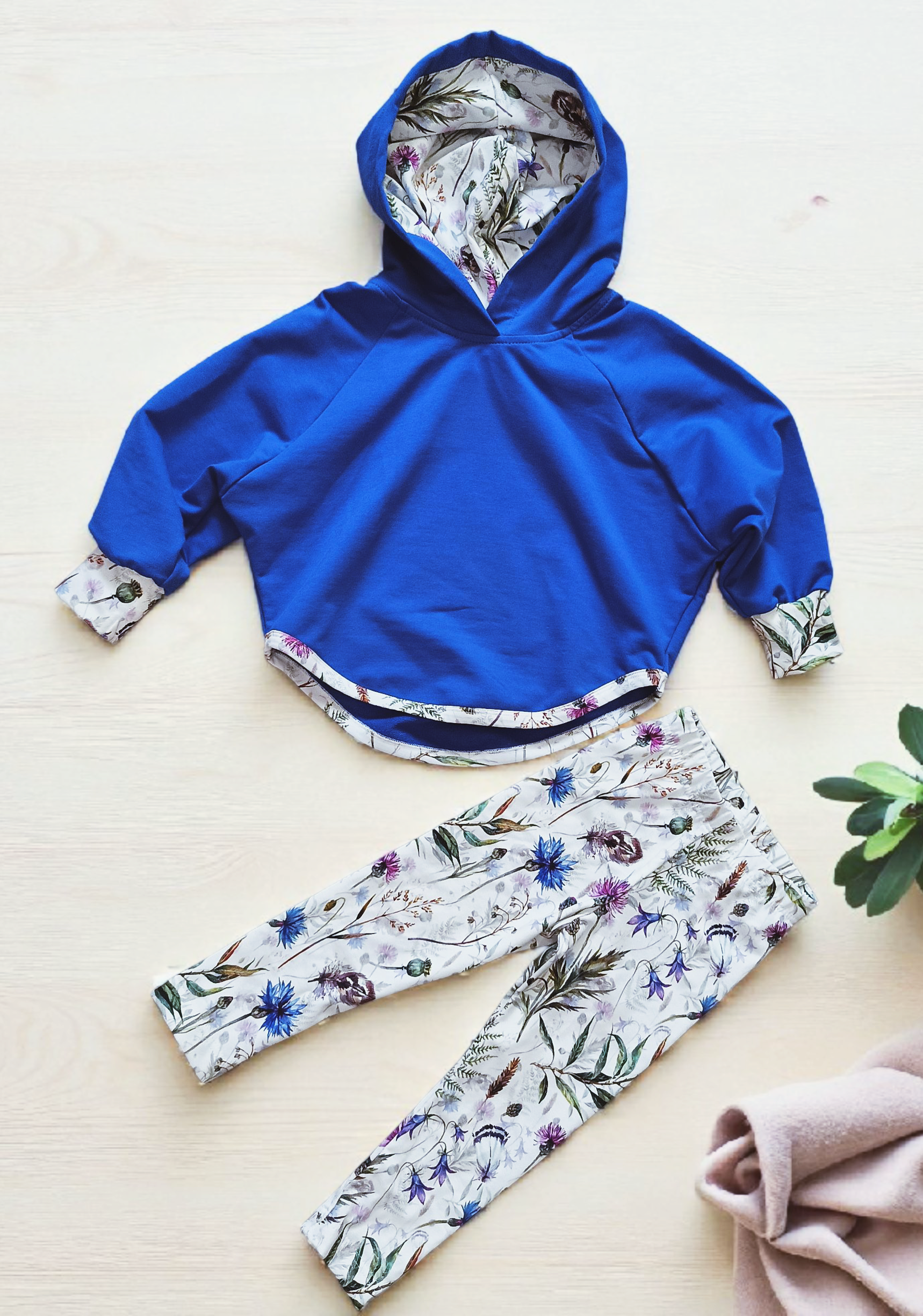 Odkryj połączenie komfortu i świeżego, naturalnego stylu. Ten zestaw składa się z miękkiej, przyjemnej w dotyku niebieskiej bluzy z kapturem, która zapewnia ciepło i swobodę ruchów, oraz spodni w botaniczny wzór z motywami delikatnych kwiatów i liści.