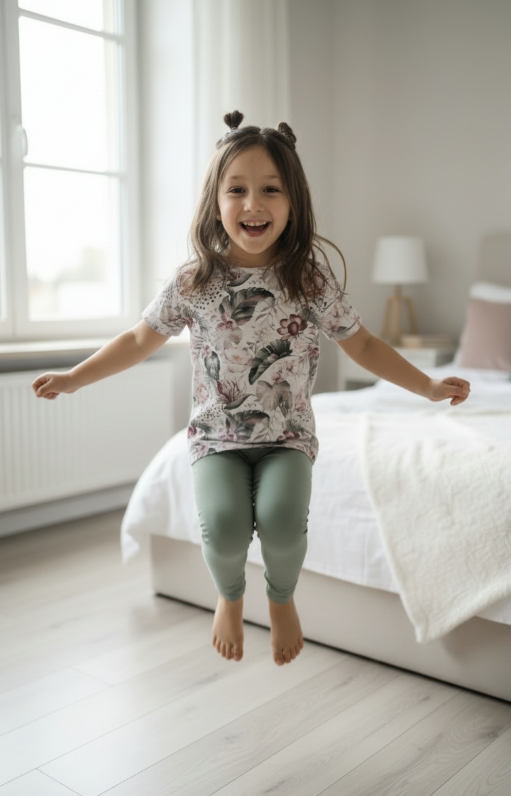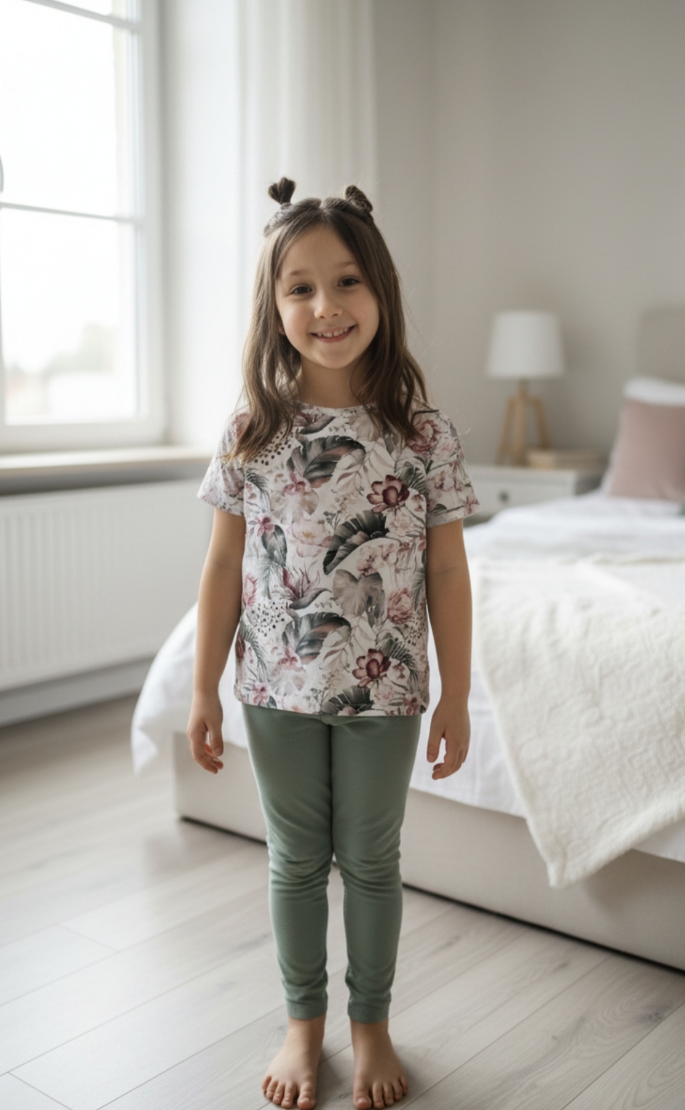 Połączenie kwiatowego T-shirtu i gładkich spodenek to właśnie to tworzy piękny komplet w którym twoje dziecko poczytuję się komfortowo .