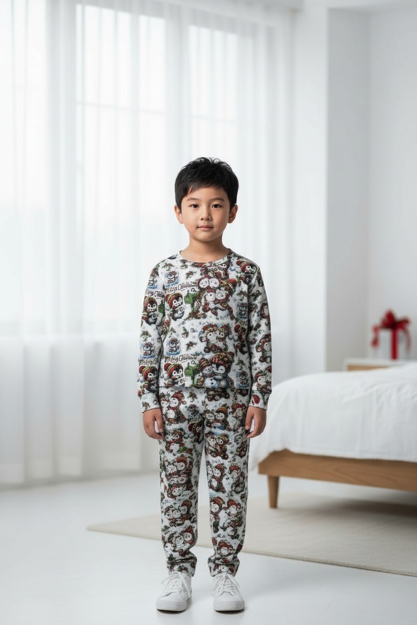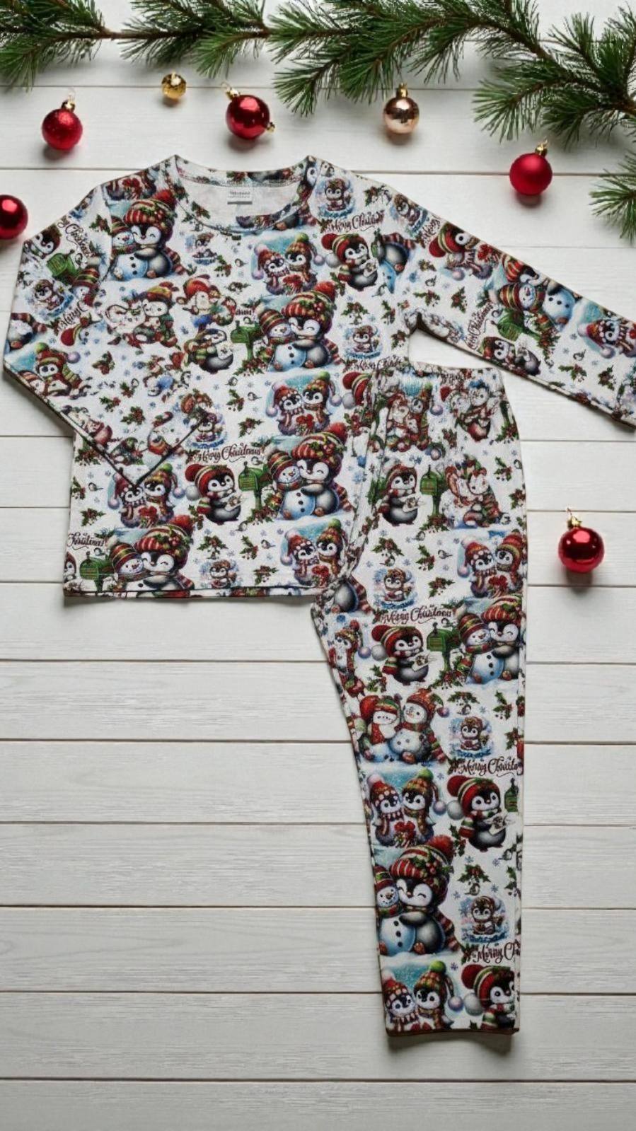 Urocza świąteczna piżama dla chłopca z wesołym motywem pingwinków, bałwanków i zimowych dekoracji. Wykonana z miękkiego, przyjemnego w dotyku materiału, który zapewnia komfort i swobodę ruchów podczas snu. Komplet składa się z bluzki z długim rękawem oraz spodni na elastycznej gumce. Idealna na zimowe wieczory i świąteczny czas.