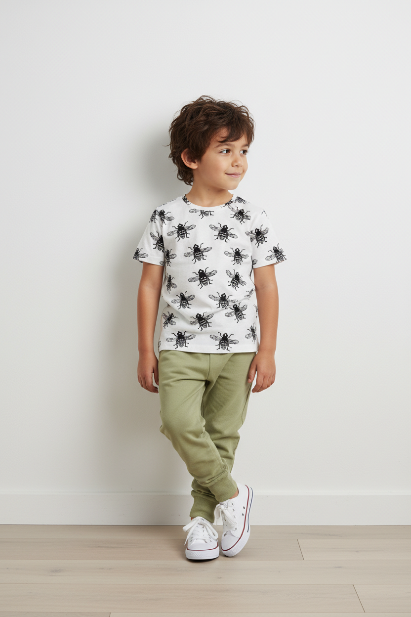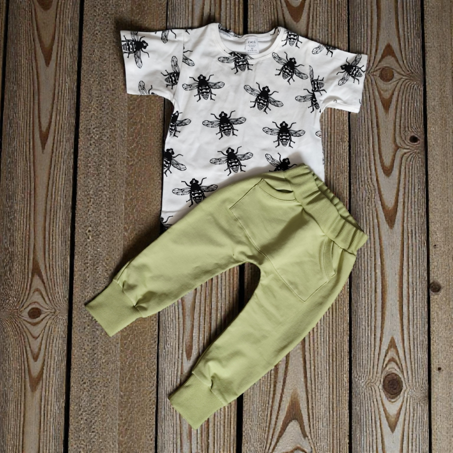 Zielony komplet ubrań dla chłopca – składa się z bawełnianej koszulki w kolorze kremowym z nadrukiem cyfrowym much oraz