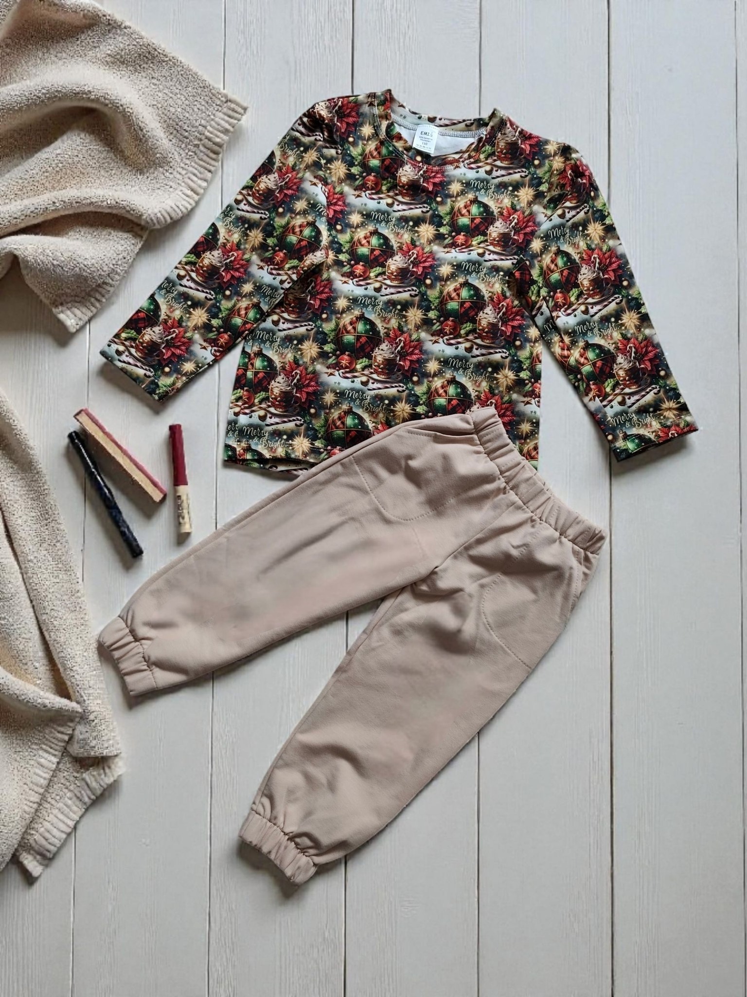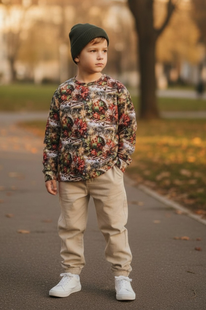 Stylowa bluza chłopięca wykonana z miękkiej, przyjemnej w dotyku dzianiny. Wzór inspirowany zimową i świąteczną tematyką nadaje jej ciepłego, wyjątkowego charakteru. Luźny krój zapewnia komfort noszenia i swobodę ruchów, idealny na co dzień oraz chłodniejsze dni.